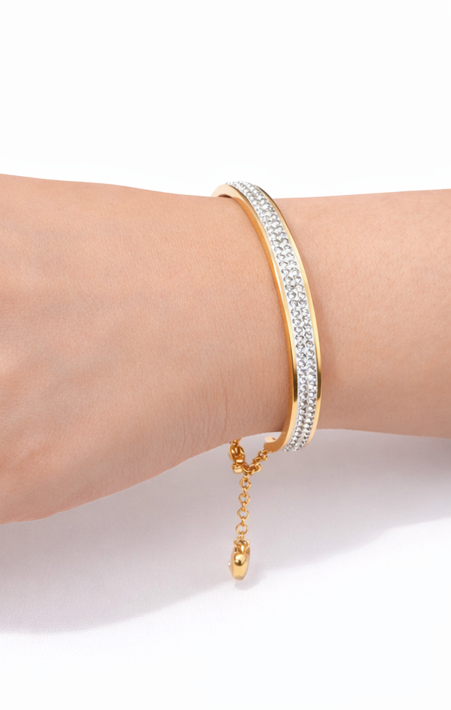 where brilliance meets craftsmanship. Two continuous rows of sparkling crystals are set with meticulous precision along a polished gold band, creating a dazzling contrast that catches the light from every angle. The warm gold tone frames each crystal perfectly, giving this piece a luxurious feel that effortlessly bridges the gap between classic and contemporary. Finished with a delicate gold extension chain, it offers a secure and adjustable fit for every wrist. Whether worn alone as a statement or layered with other pieces, this bracelet is designed to turn heads and spark conversations.